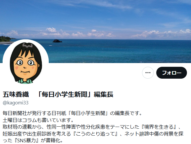 五味香織さんは、Xのアカウント『五味香織 「毎日小学生新聞」編集長』を運営しています。