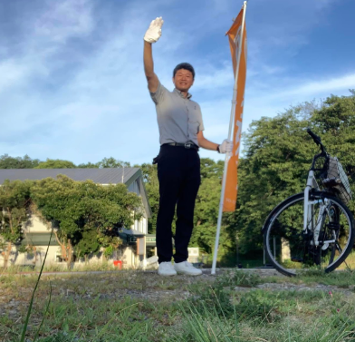 片桐基至さんの公式サイトでは「街頭演説」としてオレンジ色の旗を持っている写真が載っています。