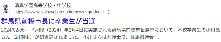 これは、2024年2月に、清真学園の公式サイトに、「卒業生の小川晶さんが前橋市長に当選した」内容の記事が載っていたことからわかります。